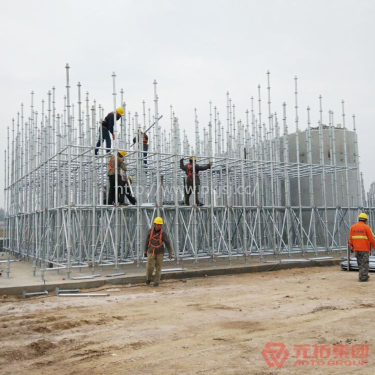 盘扣式脚手架的灵活性和通用性适合各种几何形状建筑的施工要求,以立杆部件为基础,立杆每0.5米配置一个圆盘,每个圆盘上设计有8个孔,可将其他部件连为一体,使整个结构牢固、稳定。